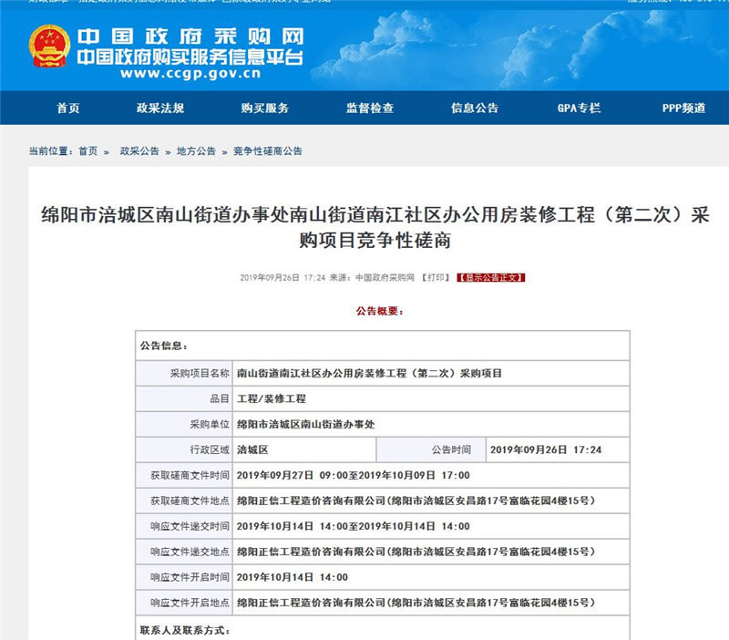 【綿陽正信·招標部消息】我公司受綿陽市涪城區(qū)南山街道辦事處委托,對南山街道南江社區(qū)辦公用房裝修工程(第二次)采購項目掛網采購,該項目于2019年09月26日在中國政府采購網掛網公示,預計于2019年10月14日14:00在綿陽正信工程造價咨詢有限公司開標室開標。