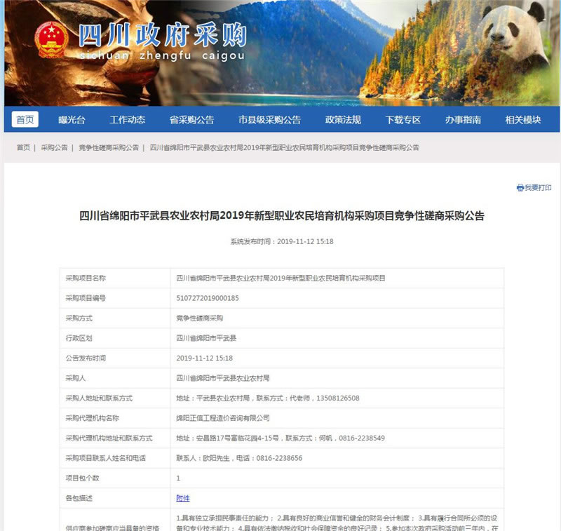 【綿陽正信·招標部消息】我公司受平武縣農(nóng)業(yè)農(nóng)村局委托,對平武縣農(nóng)業(yè)農(nóng)村局2019年新型職業(yè)農(nóng)民培育機構(gòu)采購項目競爭性磋商采購,該項目于2019年11月12日在四川省政府采購網(wǎng)掛網(wǎng)公示,預計于2019年11月22日14:00在綿陽正信工程造價咨詢有限公司開標室開標。