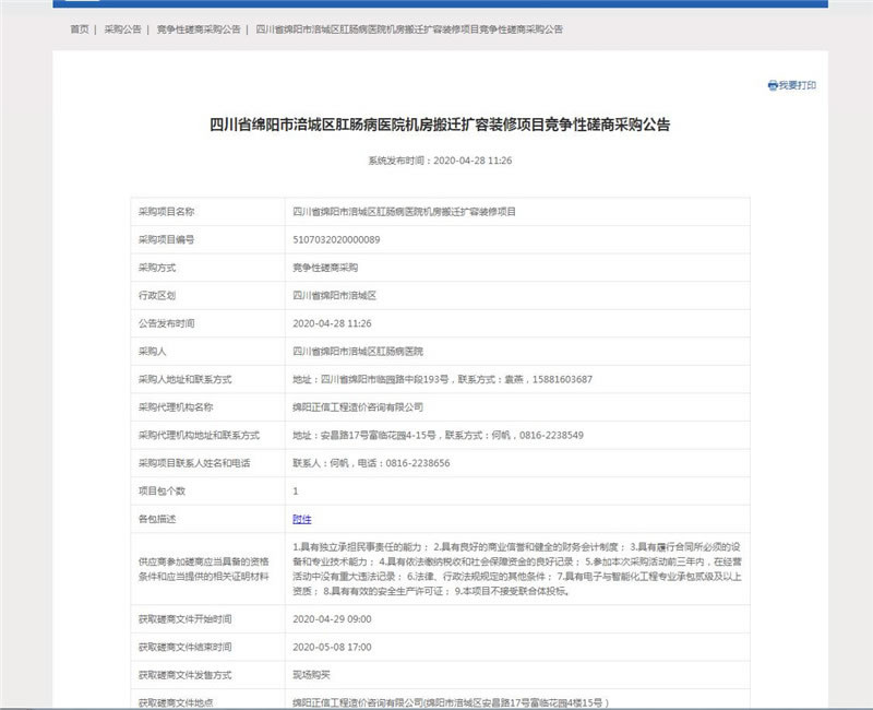 【綿陽(yáng)正信·招標(biāo)部消息】我公司受綿陽(yáng)市肛腸病醫(yī)院委托,經(jīng)綿陽(yáng)市涪城區(qū)財(cái)政局審批,對(duì)綿陽(yáng)市肛腸病醫(yī)院機(jī)房搬遷擴(kuò)容裝修項(xiàng)目擬采用競(jìng)爭(zhēng)性磋商方式進(jìn)行采購(gòu),2020年04月28日已在四川省政府采購(gòu)網(wǎng)及綿陽(yáng)政府采購(gòu)網(wǎng)將綿陽(yáng)市肛腸病醫(yī)院機(jī)房搬遷擴(kuò)容裝修項(xiàng)目競(jìng)爭(zhēng)性磋商采購(gòu)公告掛網(wǎng)公示。