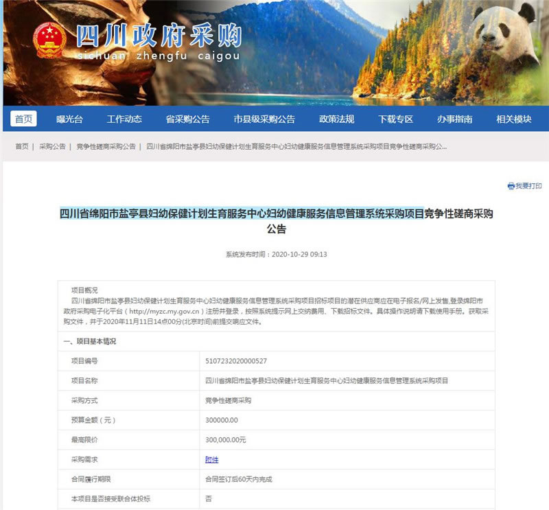 【綿陽正信·招標(biāo)部消息】我公司受四川省綿陽市鹽亭縣婦幼保健計(jì)劃生育服務(wù)中心委托,對(duì)四川省綿陽市鹽亭縣婦幼保健計(jì)劃生育服務(wù)中心婦幼健康服務(wù)信息管理系統(tǒng)采購項(xiàng)目擬采用競(jìng)爭(zhēng)性磋商方式進(jìn)行采購,本項(xiàng)目于2020年10月29日在四川省政府采購網(wǎng)、綿陽市政府采購網(wǎng)公示,預(yù)計(jì)于2020年11月11日14:00在綿陽市安昌路17號(hào)富臨花園四樓15號(hào)開標(biāo)。