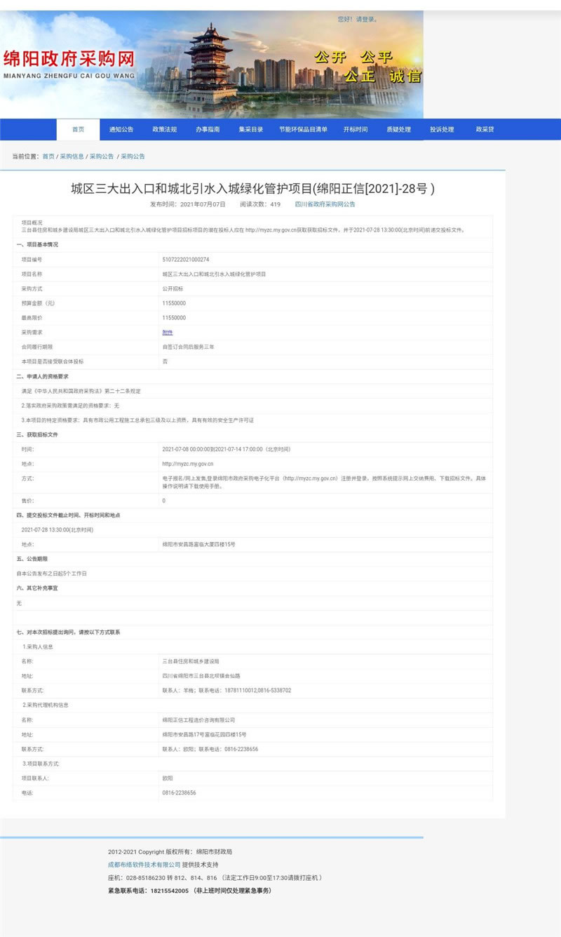 【綿陽正信·招標部消息】我公司受三臺縣住房和城鄉(xiāng)建設局委托,城區(qū)三大出入口和城北引水入城綠化管護項目擬采用公開招標方式進行采購,本項目于2021年07月07日在四川省政府采購網公示,預計于2021年07月28日13:30在綿陽市安昌路17號富臨花園四樓15號開標。