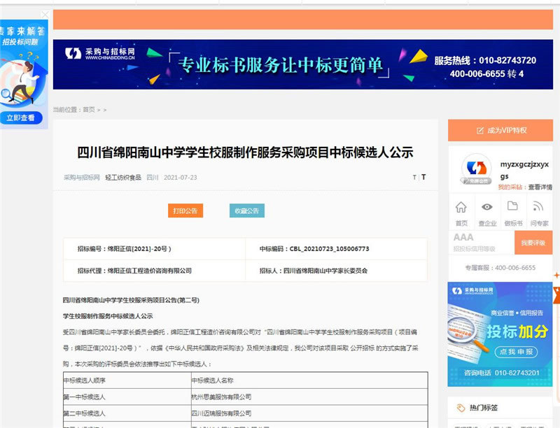 【綿陽正信·招標(biāo)部消息】我公司受四川省綿陽南山中學(xué) 四川省綿陽南山中學(xué)家長委員會(huì)委托,對(duì)四川省綿陽南山中學(xué)公開征集學(xué)生校服設(shè)計(jì)基礎(chǔ)款式采購項(xiàng)目擬采用公開招標(biāo)方式進(jìn)行采購,本項(xiàng)目于2021年06月27日在中國采購與招標(biāo)網(wǎng)掛網(wǎng)公示,于2021年07月22日14:00在綿陽科創(chuàng)區(qū)劍南路西段388號(hào)長興星城3棟2樓11號(hào)順利開標(biāo)。